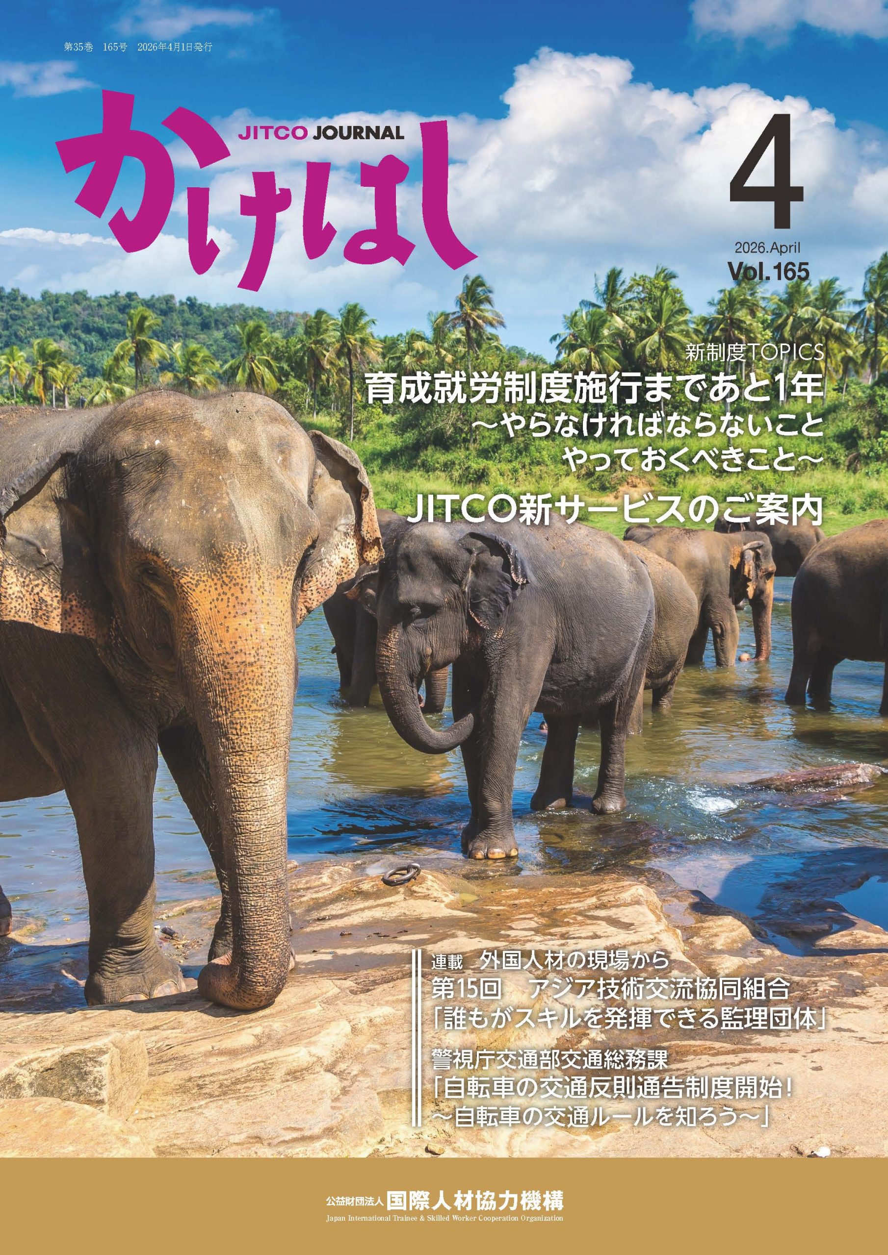 総合情報誌「かけはし」は、賛助会員向けの“お役立ちマガジン”です。年に4回(4月、7月、10月、1月)発行し、お手元にお届けしています。新制度に関する話題や外国人材の受入れに関する好事例の紹介、JITCOの活動報告、様々なサービスのご案内など、賛助会員の皆様のお役に立てる記事を多数掲載しております。ぜひご利用ください。