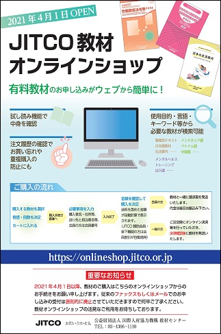 JITCO教材センターは2021年4月1日、各種有料教材のご注文をインターネットのサイト上で受け付ける電子商取引(EC)サイトを開設しました。