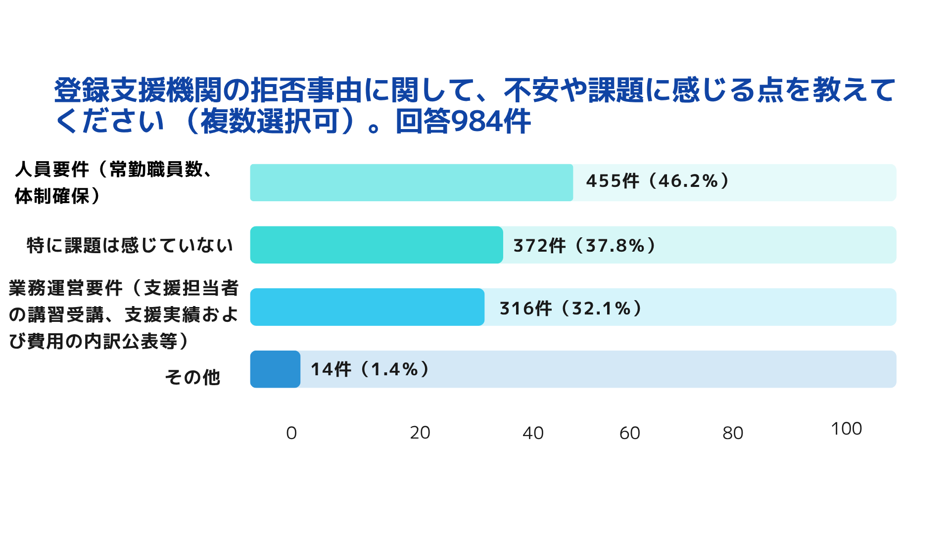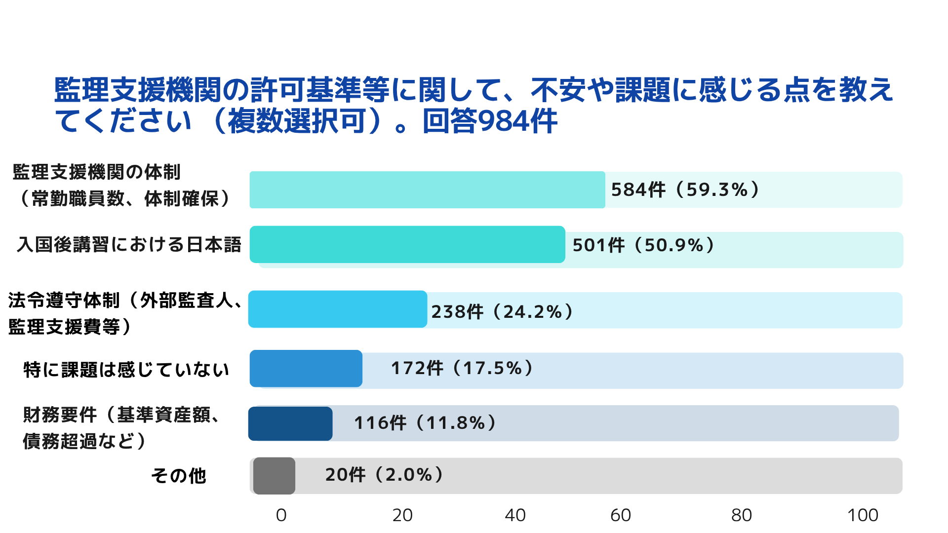 このほか、JITCOに期待する支援事業について「育成就労制度の最新情報セミナー(関係省令・運用要領・分野別運用方針など)」、「監理支援機関の許可・登録支援機関の登録に係る申請書類作成手続きの教材、実務的なサポート」、「育成就労、特定技能における義務的な講習の実施」、「育成就労、特定技能における送出し国の最新情報」などのご意見・ご要望をいただきましたので、今後の事業の参考とさせていただきます。ご協力ありがとうございました。