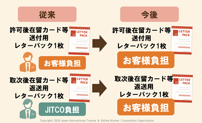 これまで、在留カード返却時に使用する「レターパックプラス」の費用はJITCOにて負担しておりましたが、2026年4月1日以降に受け付けるご依頼から、返送用レターパックプラスのご負担方法を以下のとおり変更いたします。